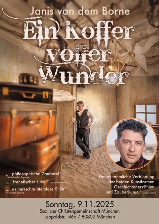 Ein Koffer voller Wunder Ein Abend mit Zauberkunst von Janis von dem Borne, siehe Brief.SonstigesSonntag, 09.11.202519:00 UhrVeranstalter: Christengemeinschaft München-Mitte